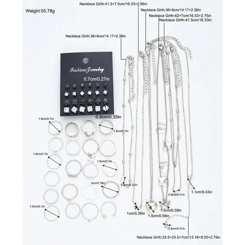 51 Pcs/Set Silver Color Chic Jewelry Set For Women Fashion Butterfly Heart Pearl Necklaces, Earrings, Rings, Match Daily Outfits Ewkiki