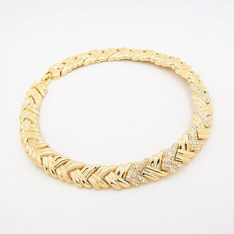 Dubai Jewelry is known for its extravagant and exquisite designs. This 24k gold plated jewelry set, featuring a beautiful necklace and earrings, showcases a blend of elegance and contemporary style. The quality craftsmanship ensures durability, making it perfect for everyday wear or special occasions. Because of its stunning aesthetics, this jewelry set easily attracts attention and enhances any outfit, whether it's for a wedding or a vibrant party.